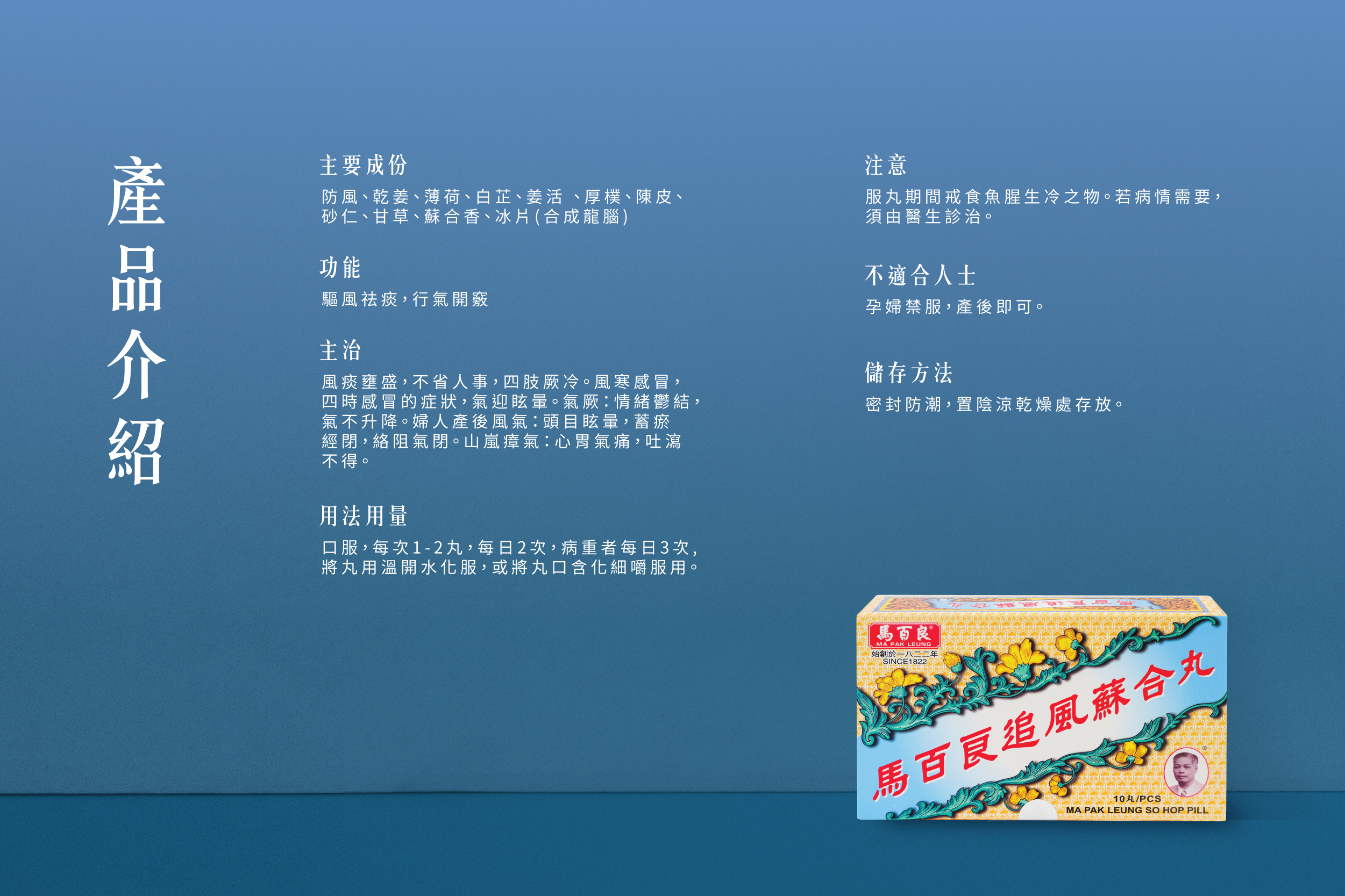 凡被風寒惡氣所侵,即生疾病,甚至猝然暈倒,皆宜急用此丸治之。本丸有驅風及救急扶危之力,男女皆宜服用。